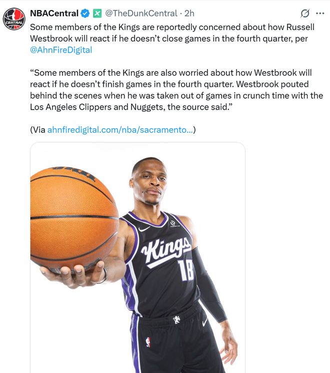 知名賬號NBACentral援引了記者AhnFireDigital的報道稱,盡管小薩博尼斯、德羅贊和拉文等核心球員都表示很高興能和威少一起打球,但一位聯盟消息人士告訴AhnFireDigital,國王隊內并非所有人都對威少的加盟感到興奮。國王隊的一些隊員也擔心威少如果在第四節(jié)無法完成比賽會作何反應。消息人士稱,在上賽季對陣洛杉磯快船隊和掘金隊的關鍵時刻被換下場后,威少在場下撅著嘴很不高興。