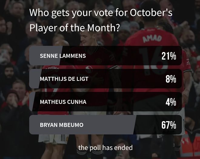 姆伯莫以67%的得票率勝出,遠(yuǎn)超拉門斯(21%)、德利赫特(8%)和庫(kù)尼亞(4%)。這位喀麥隆國(guó)腳在2-0戰(zhàn)勝桑德蘭的比賽中為梅森·芒特精彩的首開紀(jì)錄送出助攻,并在安菲爾德對(duì)陣?yán)锲帜菆?chǎng)難忘的2-1勝利中,僅用一分鐘就幫助曼聯(lián)取得領(lǐng)先。